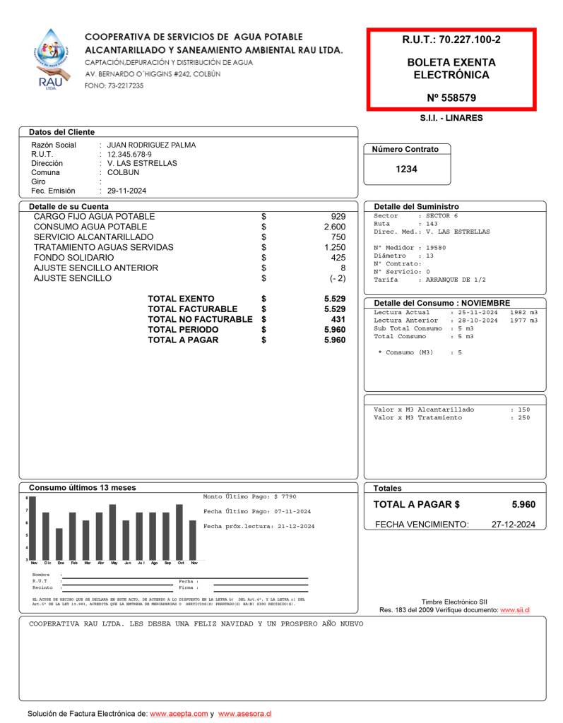 COMSUMO AGUA POTABLE: Valor por la cantidad de metros cúbicos de agua consumidos en el mes. Este monto es variable según su consumo.